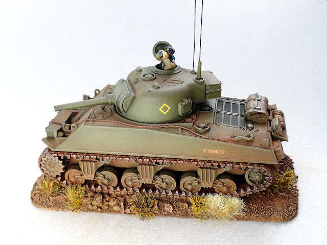 The Firefly VC is the older Warlord kit released in resin, and was a fine kit to put together. A glance at the newer plastic kits compared to the resin kit suggests that the detail on the resin kit is a bit crisper, and "deeper" than the plastic kit - which betrays its origins as a scale-up of a 15mm kit. (I haven't yet built a Warlord plastic Sherman VC, so this criticism might be misplaced and unfair, but my first impression of the plastic offering is that the detail is "flat" and "soft".) Crew figure is from Perry Miniatures, and the baggage bits and bobs from Die Waffenkamer and Warlord Games.